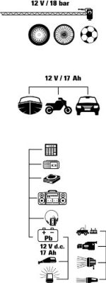 Aufgrund des integrierten, max. 100 W starken 230 V Spannungswandlers ist die Energiestation sowohl zur Stromversorgung von 12 V Gleichstromverbraucher als auch für kleinere 230 V Verbraucher (Radio, Laptop, Handy usw.) bestens geeignet. Außerdem bietet die Energiestation durch die Starthilfeeinrichtung eine Hilfe bei Startschwierigkeiten bei PKW´s mit Benzinmotor und Motorrädern. Ein integrierter, leistungsstarker Kompressor erzeugt bis zu 18 bar Luftdruck und ist bestens zum Füllen von Sportbällen, kleinen Luftmatratzen usw. geeignet. Im schlagfesten Kunststoffgehäuse mit Tragegriff ist eine, mit weißen Hochleistungs-LED´s ausgestattete, Beleuchtung sowie ein Warndreieck integriert.