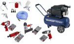 inkl. Druckluft-Schlagschrauber, Meisselhammer, Tacker-/Nagler-Set, Stabschleifer-Set, Gewebeschlauch, 4 tgl. Druckluft-Set, 8 tlg. Aufblas-Adapter-Set