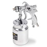 Bei Saugbecherpistolen befindet sich der Tank unterhalb des Sprühkopfes. Der Farbtransport erfolgt durch Ansaugen. Dank der Konstruktion kann die Saugbecherpistole überall ohne Halter abgestellt werden.